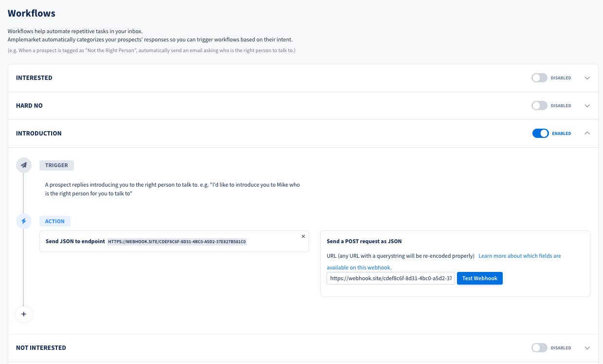 On Amplemarket, the following classifications will be pushed through a webhook:- An interested reply